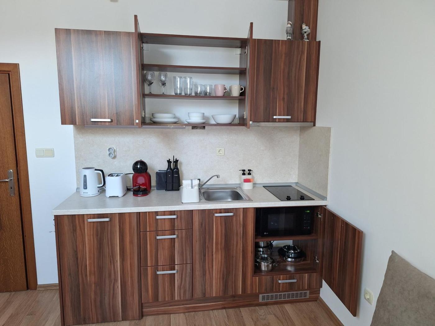 Studio Apartment. This apartment comprises 1 living room, 1 separate bedroom and 1 bathroom with a bath and free toiletries. Guests will find a stovetop, a refrigerator, kitchenware and a microwave in the well-equipped kitchen. The apartment also provides guests with a barbecue. This apartment features a coffee machine, flat-screen TV with cable channels, garden views, as well as winechampagne for guests. The unit offers 2 beds.