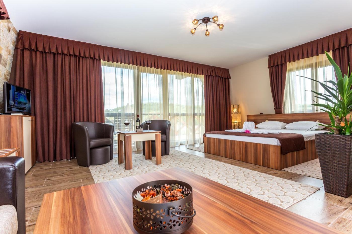 Premium Suite with Hot Tub. This suite features a balcony with a beautiful view, heated jacuzzi, free mini bar, free access to the 6 pools, water slides, sunbeds and free parking. ;