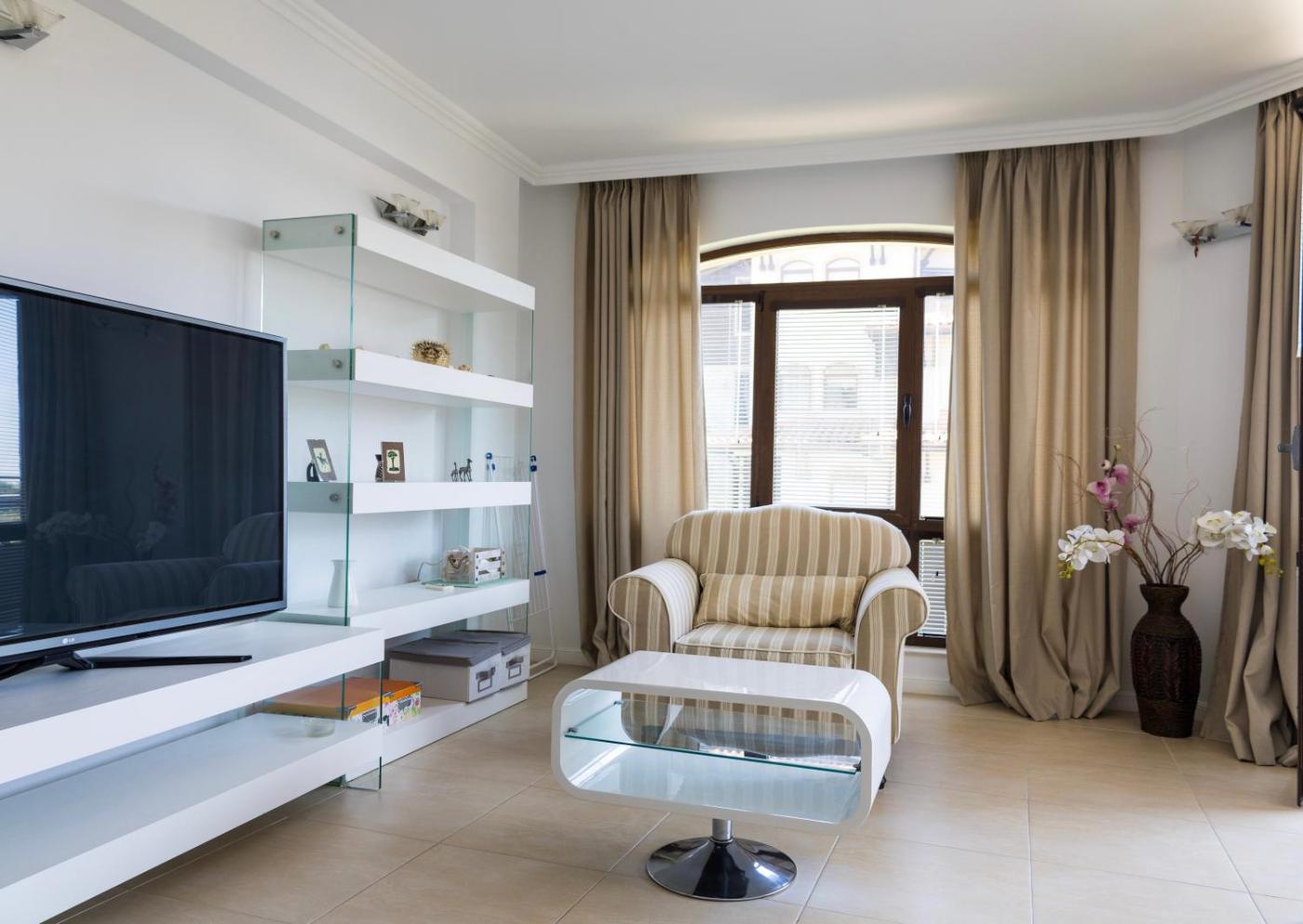One-Bedroom Apartment. This apartments standout feature is the pool with a view. This spacious apartment includes 1 living room, 1 separate bedroom and 1 bathroom with a shower and a hairdryer. Guests can make meals in the kitchenette that is fitted with a stovetop, a refrigerator, a dishwasher and kitchenware. The air-conditioned apartment offers a flat-screen TV with cable channels, a washing machine, a wardrobe, an electric kettle as well as sea views. The unit has 2 beds.