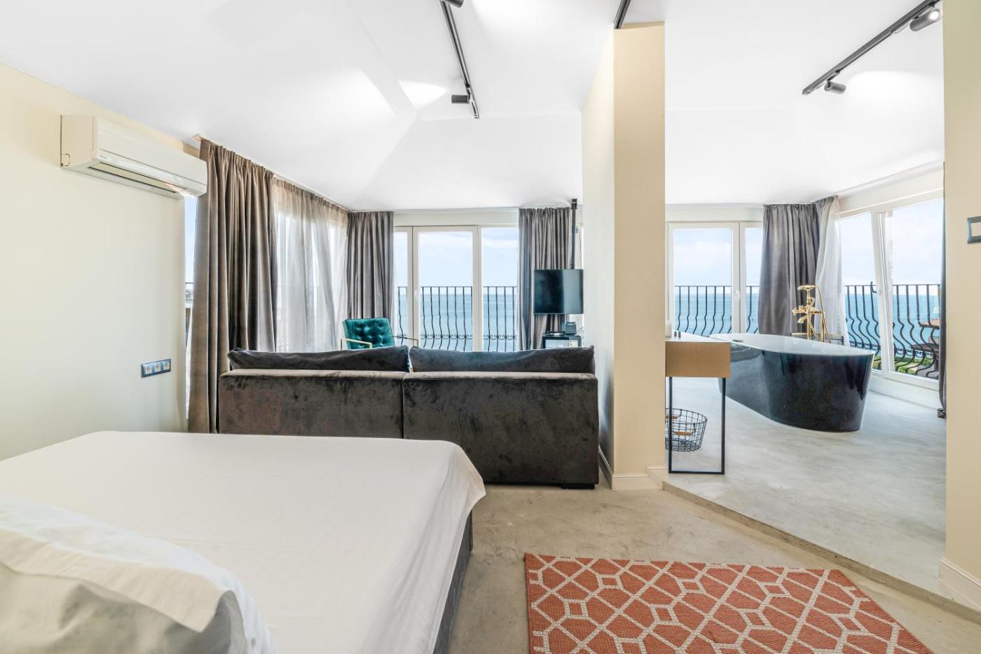 Deluxe Suite with Bathtub & Panoramic Sea View. This suite features 1 living room, 1 separate bedroom and 1 bathroom with a bath and free toiletries. The air-conditioned suite features a flat-screen TV, a minibar, a coffee machine, a seating area as well as sea views. The unit has 2 beds.