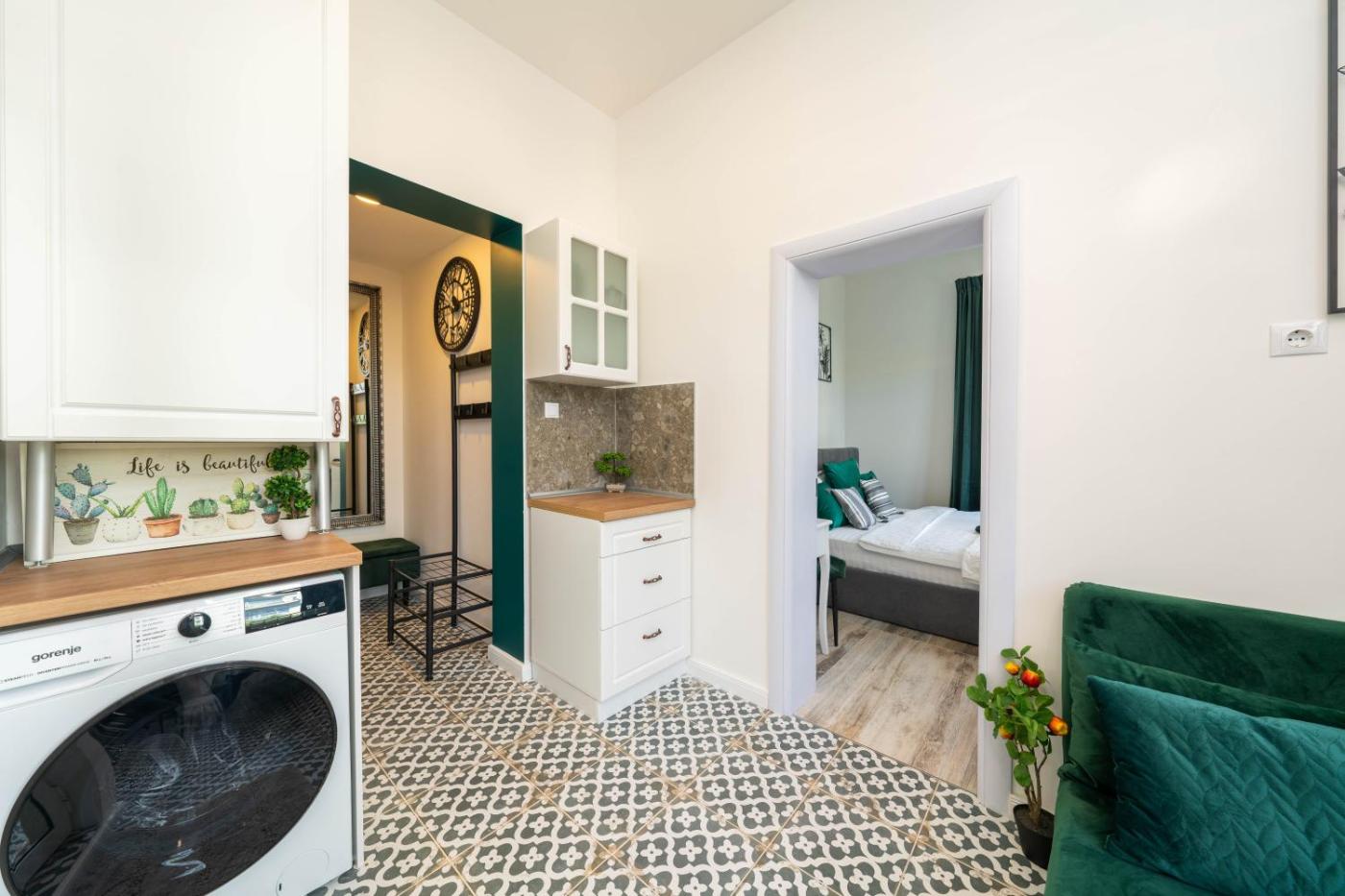 One-Bedroom Apartment. This spacious apartment includes 1 living room, 1 separate bedroom and 1 bathroom with a walk-in shower and free toiletries. In the kitchen, guests will find a stovetop, a refrigerator, a dishwasher and an oven. The air-conditioned apartment offers a flat-screen TV with streaming services, a washing machine, a private entrance, soundproof walls as well as city views. The unit has 2 beds.