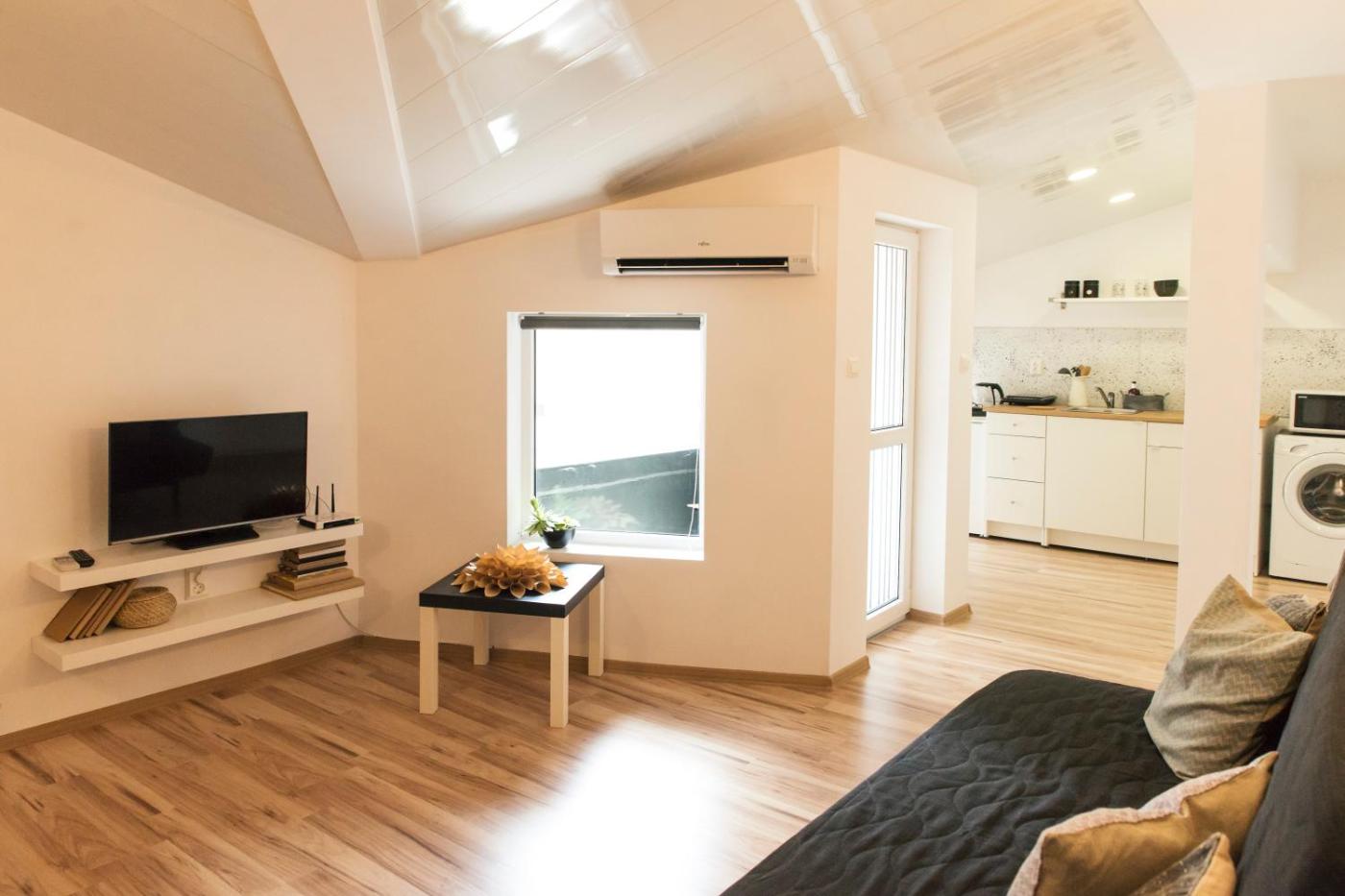 Apartment. Boasting a private entrance, this air-conditioned apartment features 1 living room, 1 separate bedroom and 1 bathroom with a shower and a hairdryer. In the well-equipped kitchen, guests will find a stovetop, a refrigerator, kitchenware and a microwave. Featuring a terrace with city views, this apartment also features a washing machine and a flat-screen TV with satellite channels. The unit has 1 bed.