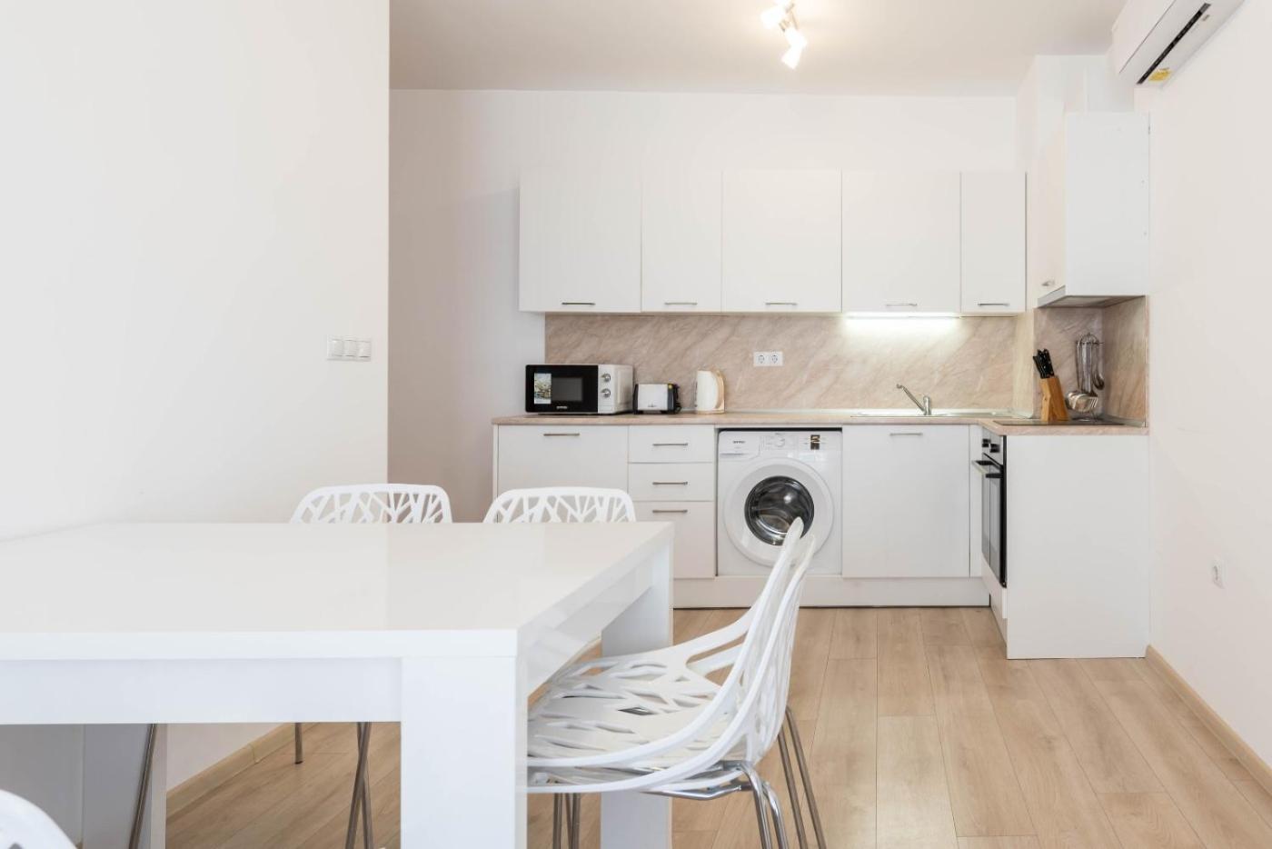 Two-Bedroom Apartment. Featuring a private entrance, this air-conditioned apartment comprises 1 living room, 2 separate bedrooms and 1 bathroom with a shower and a hairdryer. In the kitchen, guests will find a stovetop, a refrigerator, kitchenware and an oven. The spacious apartment provides a washing machine, a tea and coffee maker, a seating area as well as a terrace with sea views. The unit offers 3 beds.