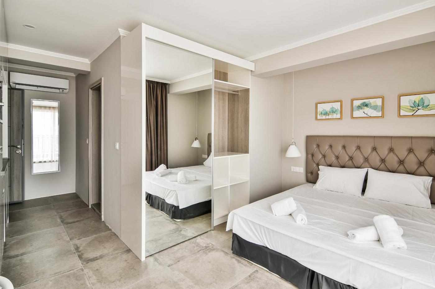 Deluxe Double Studio. Meals can be prepared in the kitchenette, which comes with a refrigerator, kitchenware, a microwave and a tea and coffee maker. This air-conditioned studio includes a flat-screen TV with satellite channels, a private bathroom as well as a terrace. The unit offers 1 bed. ;